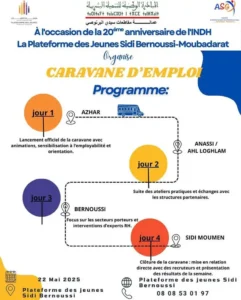 Description de l’événement: À l’occasion du 20ᵉ anniversaire de l’Initiative Nationale pour le Développement Humain (INDH), la Plateforme des Jeunes Sidi Bernoussi – Moubadarat organise la Caravane d’Emploi, du 22 au 25 mai 2025.