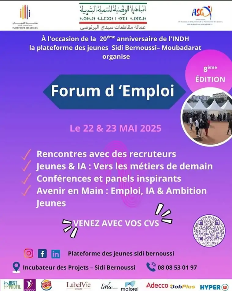 Description de l’événement: La Plateforme des Jeunes Sidi Bernoussi – Moubadarat organise un événement dédié à la promotion de l’emploi et de l’entrepreneuriat chez les jeunes.